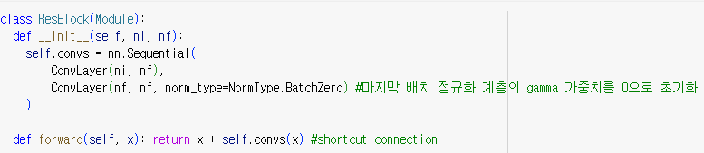 - ConvLayer(nf, nf, norm_type=NormType.BatchZero) 위에서 정의한 ConvLayer와 비슷하지만, 이번에는 입력 채널 수와 출력 채널 수가 모두 nf로 동일합니다. 또한, norm_type=NormType.BatchZero 인자를 전달하여 Batch normalization을 사용하면서 마지막 배치 정규화 계층의 가중치를 0으로 초기화하는 방법을 적용합니다.