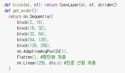 - ConvLayer(ni, nf) ConvLayer는 사용자 정의 함수로, 컨볼루션(Convolution) 레이어를 생성하는 역할을 합니다. 이 함수는 입력 채널 수 ni와 출력 채널 수 nf를 받아서 컨볼루션 레이어를 생성합니다.