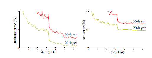 배치정규화를 사용했음에도 불구하고 더 많은 계층으로 구성된 신경망이 더 적은 계층의 신경망보다 성능이 뛰어나지 않은 문제 발생. 이러한 성능 저하는 과적합 때문이 아님. 또한 적당히 깊은 모델에 계층을 더 많이 추가하면 학습용 데이터셋에서 오차가 더 커짐. 깊은 레이어까지 잘 학습이 되도록 하는 방법 고민