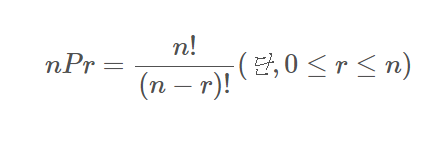 순열은 서로 다른 n개의 대상에서 r개를 뽑아 일렬로 배열한 것을 말한다. 이때 나올 수 있는 경우의 수를 수학식으로 아래와 같이 표현한다. 이때 배열의 순서를 고려해야 한다. 순서가 다르면 서로 다른 순열이다.